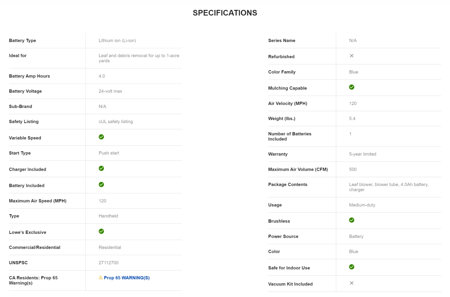 The turbine fan delivers powerful airflow of up to 500-CFM and 120-MPH to quickly clear leaves and debris with its durable brushless motor.